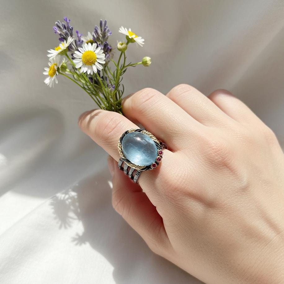 This ring is handcrafted in sterling silver with delicate black rhodium and gold accents. It showcases a luminous oval aquamarine, ethically sourced from Africa, paired with deep rhodolite touches. Its branch-inspired design echoes ocean waves and nature’s textures. Each gemstone is unique and carefully selected from small family-run sources.