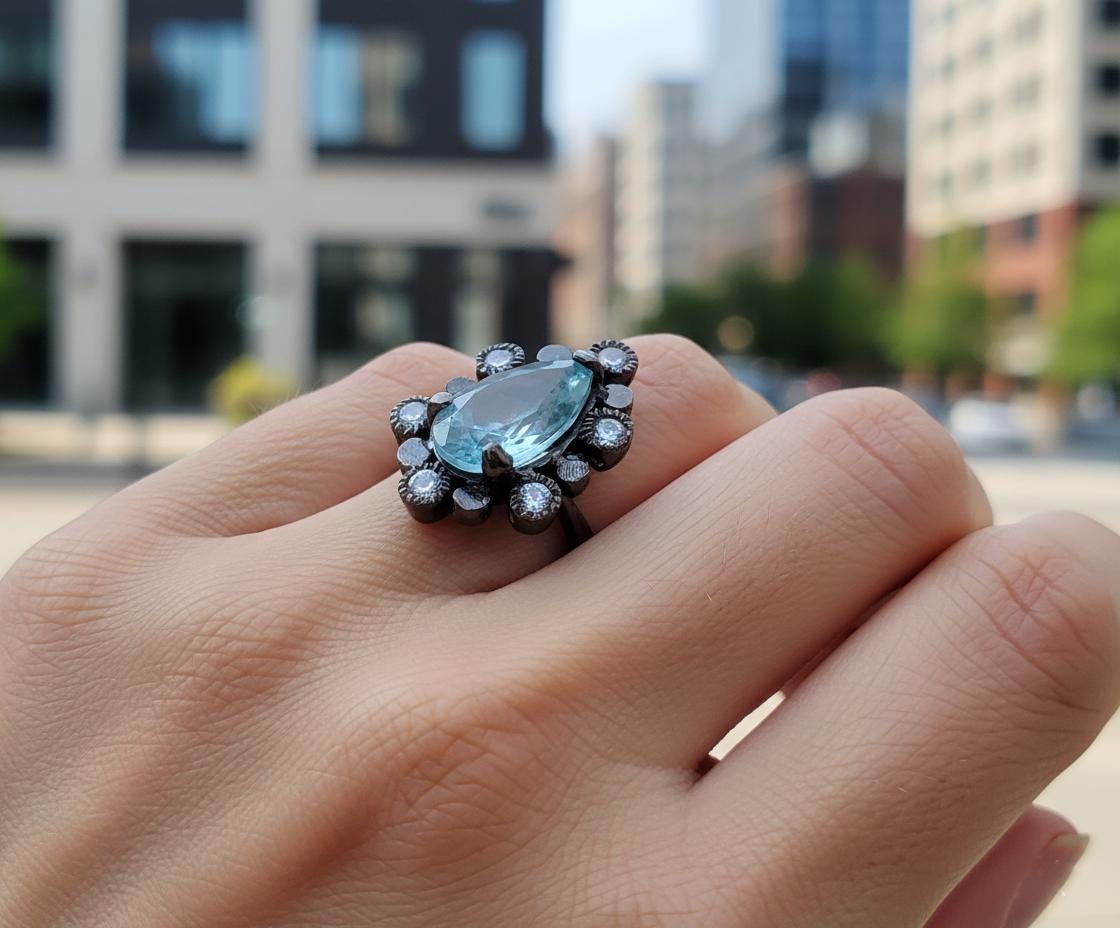 Black rhodium-plated sterling silver ring with pear-shaped blue kyanite. Nature-inspired Art Nouveau design. Ethically crafted statement jewelry.