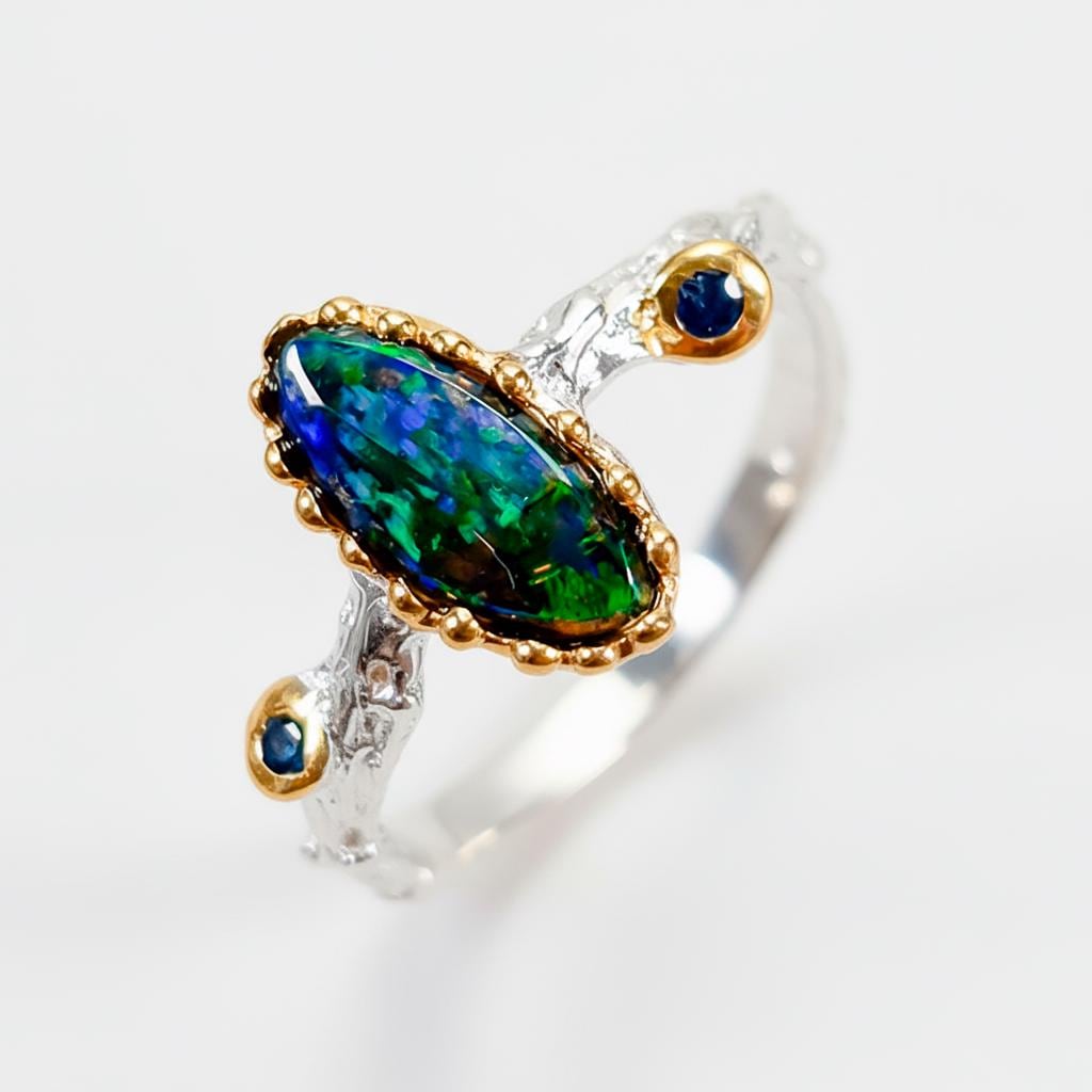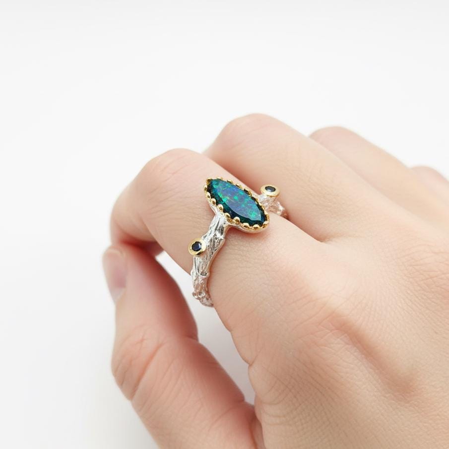 This ring is handcrafted in sterling silver with a glowing black opal center and tiny sapphire accents. It has a nature-inspired branch texture and a soft multi-tone gold finish. Each gemstone is ethical, unique, and sourced from small family-run businesses.