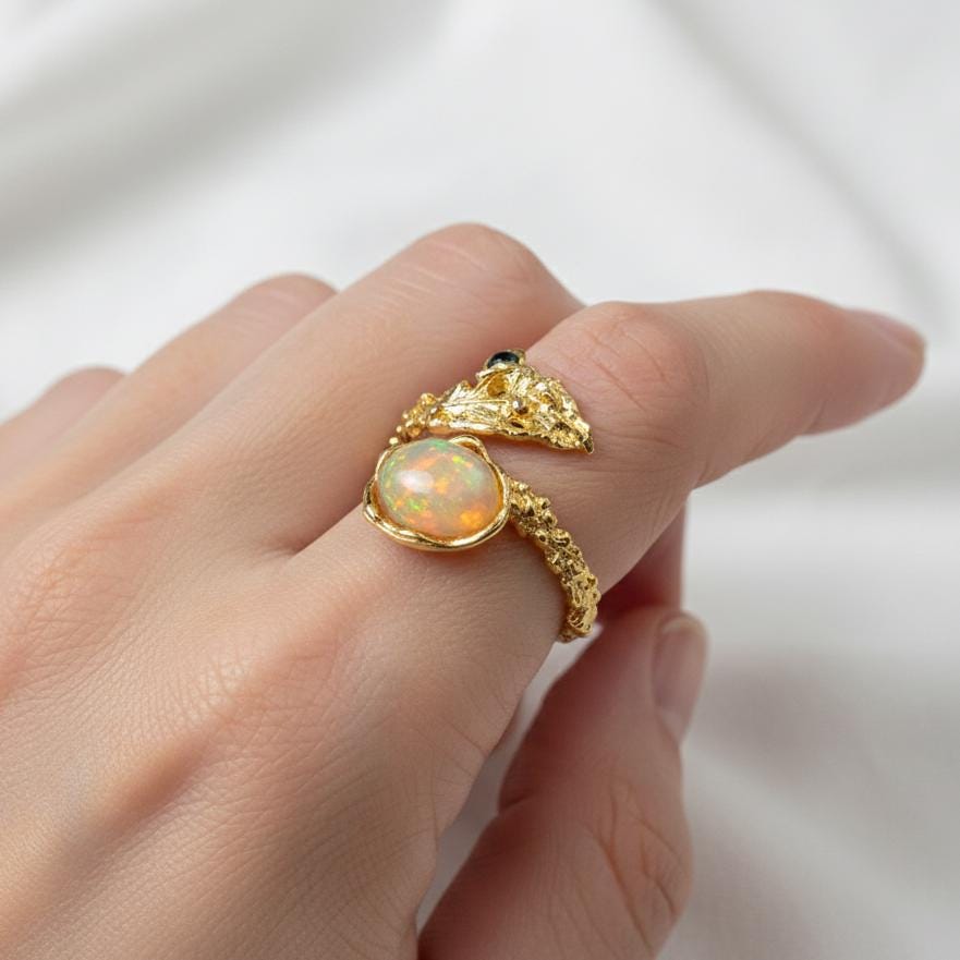 This 925 sterling silver fire opal ring glows with vibrant orange tones, making it a striking choice for October birthstone jewelry. Crafted in a nature inspired botanical design, the gemstone is framed by leaf and branch details for a unique look. As an adjustable ring, it offers comfort and flexibility for everyday wear. Perfect as a promise ring, family birthstone gift, or wedding guest accessory, this handcrafted opal ring is a radiant addition to any jewelry collection.