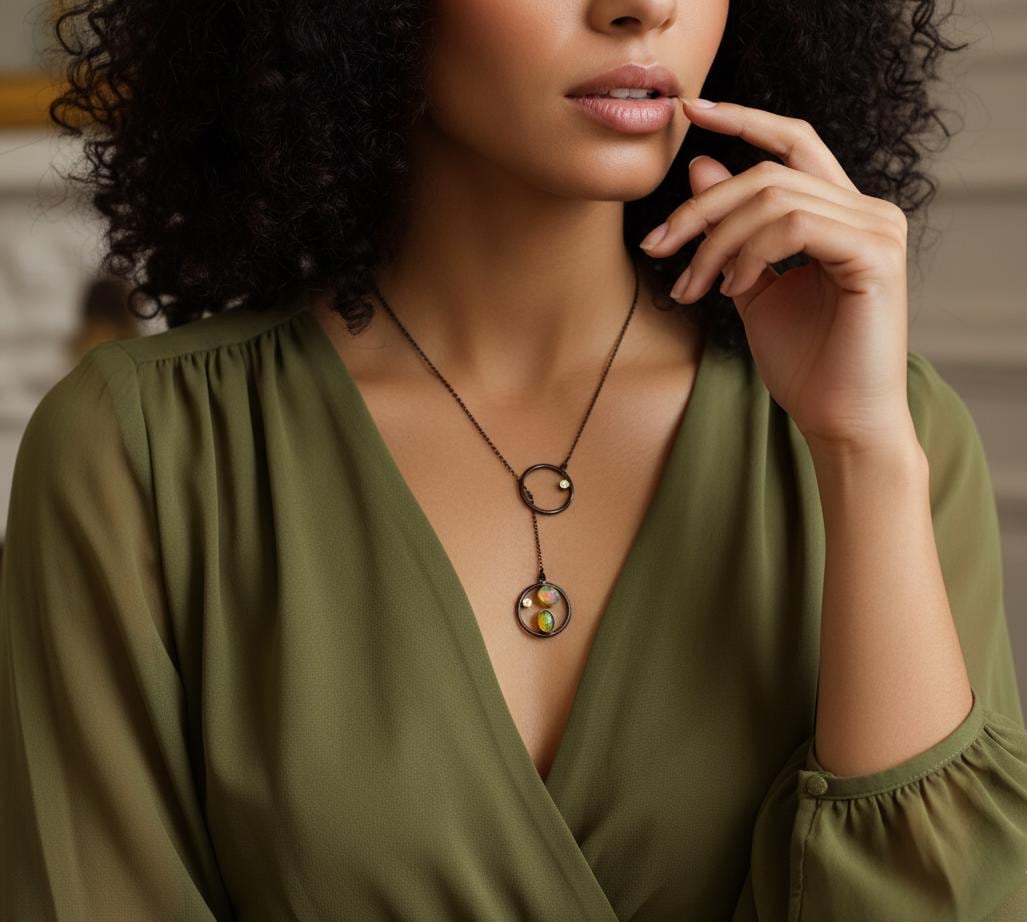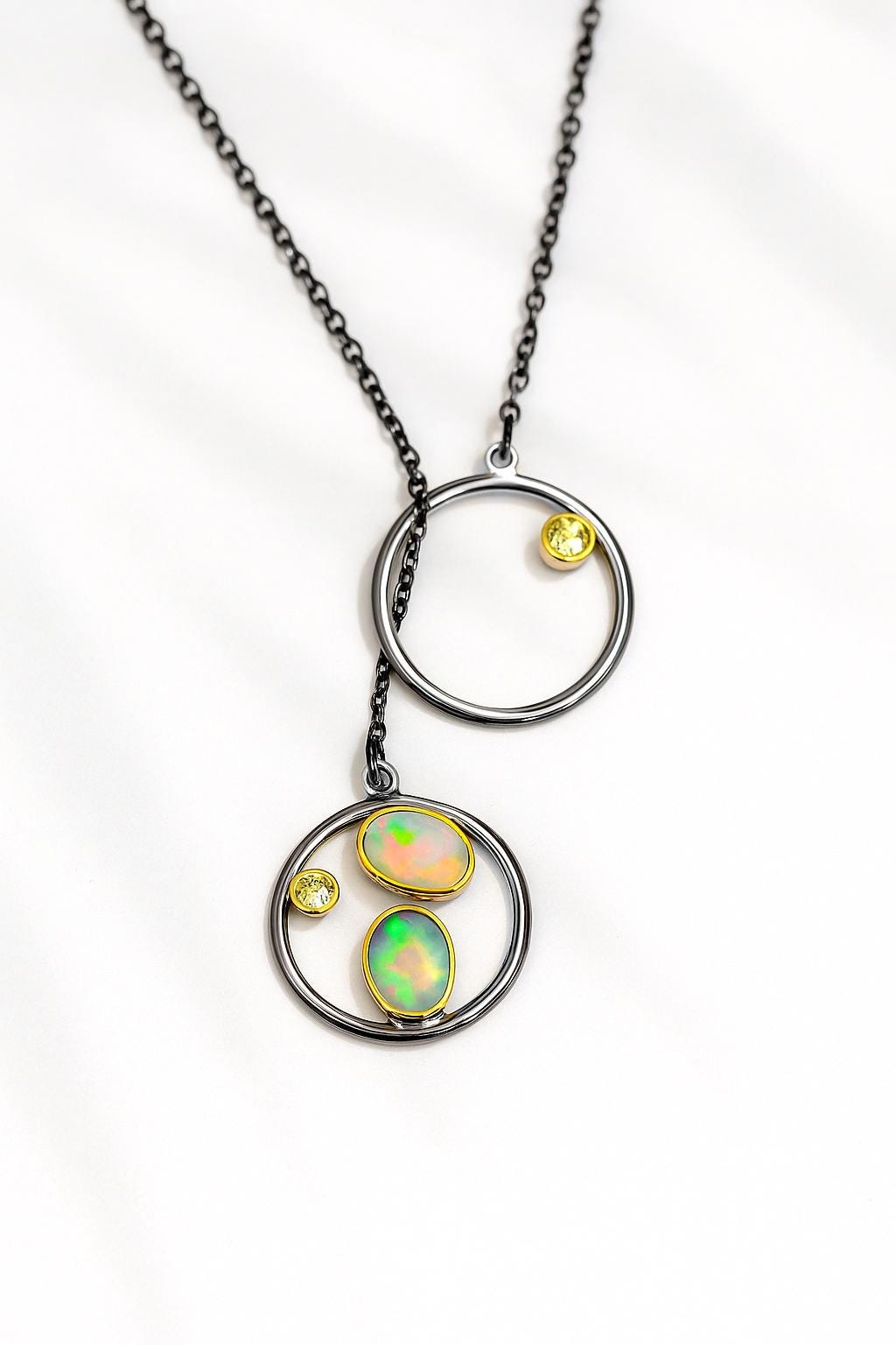 925 rainbow opal two-circle infinity pendant necklace in sterling silver with black & gold plating. Adjustable length piece, perfect October birthstone gift.