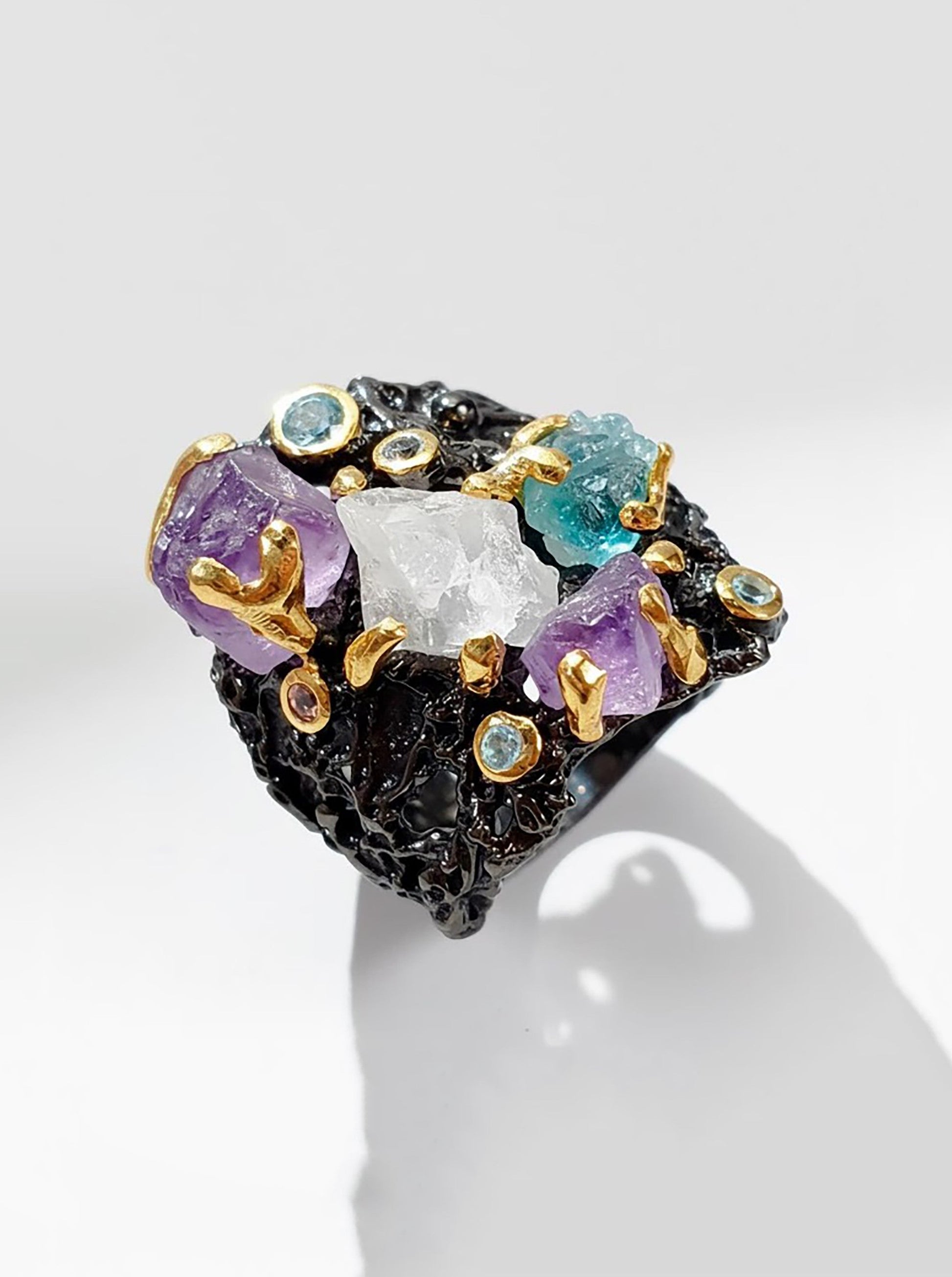 Sterling silver wide-band raw purple amethyst ring with mixed gemstone cluster. Bold nature-inspired statement jewelry. Ethically made February birthstone design.