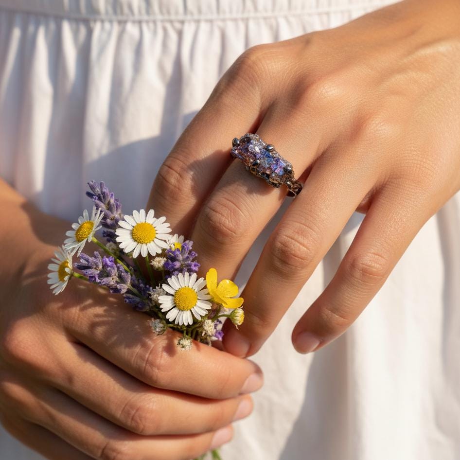 This raw bismuth ring is a bold statement piece for men and women, featuring a natural rainbow bismuth crystal set in a textured 925 sterling silver band. Each uncut crystal forms vivid geometric layers and metallic hues, symbolizing creativity, transformation, and grounding. The rugged yet refined design makes it perfect for those who love organic, modern designer jewelry. Ideal as a Christmas gift for men, a unique raw stone ring for collectors, or an artisanal accessory that expresses individuality and connection to nature.