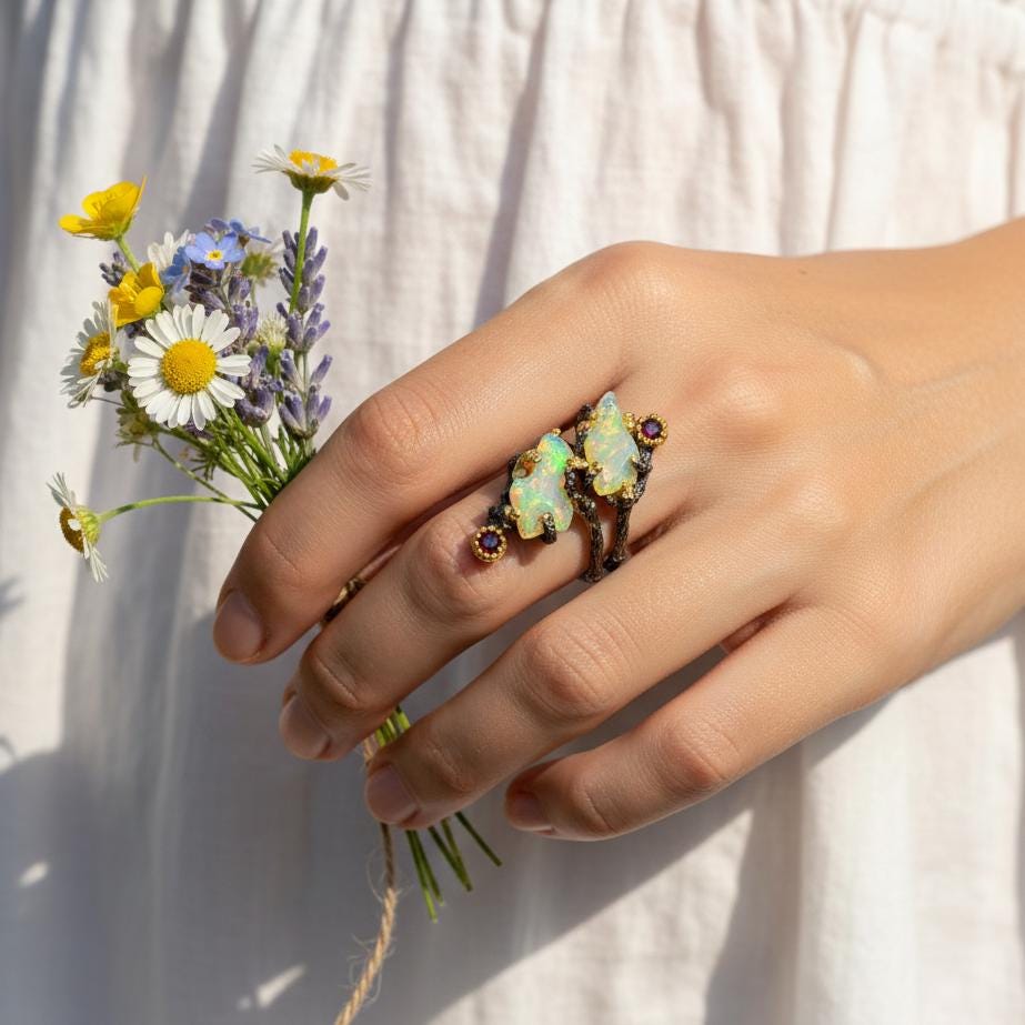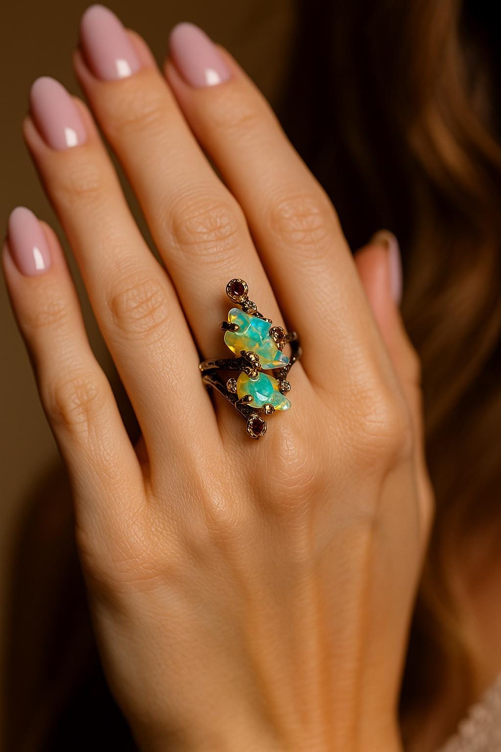 925 Sterling Silver Raw Fire Opal Branch Ring