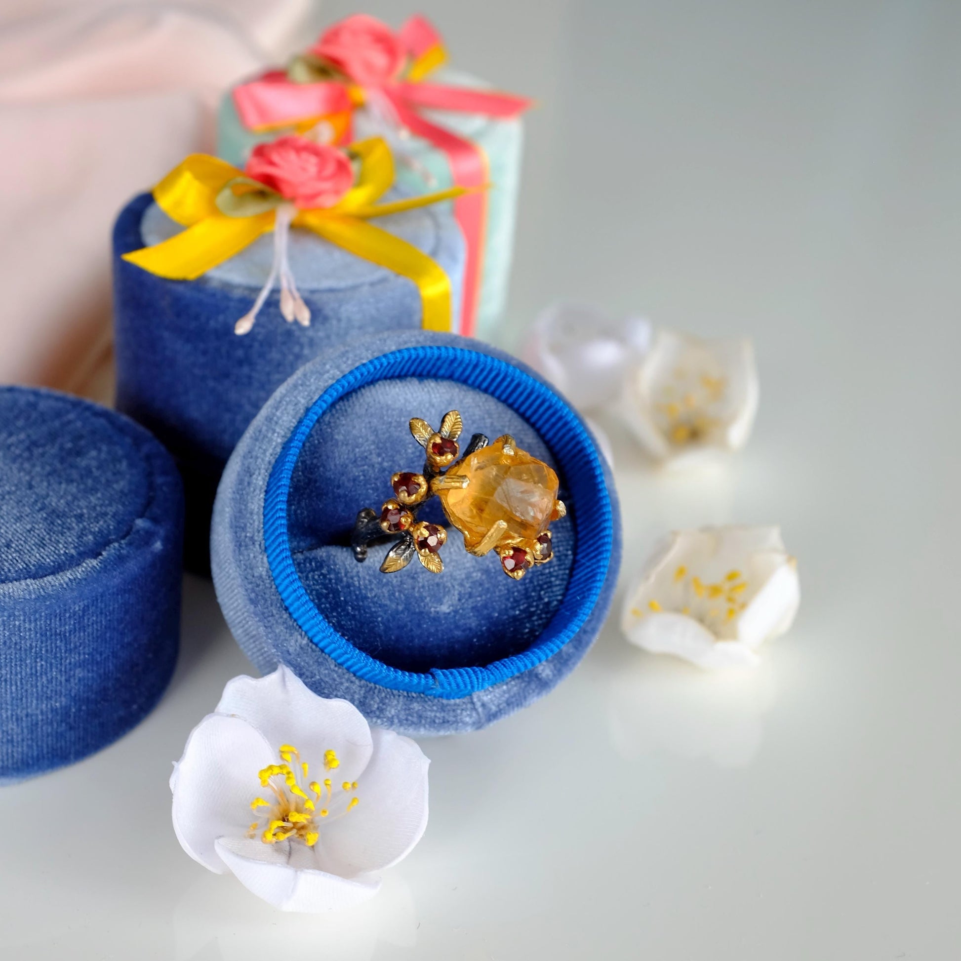 This ring is made with raw citrine, a gemstone glowing in warm golden tones, set in sterling silver. The branch and leaf design wraps naturally around the stone, accented with delicate flower details. Each ring is handmade, so the texture and shade of the citrine will be slightly different—making your piece one of a kind. Citrine is the November birthstone, a symbol of warmth and joy, making this ring a thoughtful gift for birthdays, anniversaries or Christmas. With its mix of fairy core charm and botanical style, it feels both whimsical and elegant. A ring she’ll treasure and wear often.