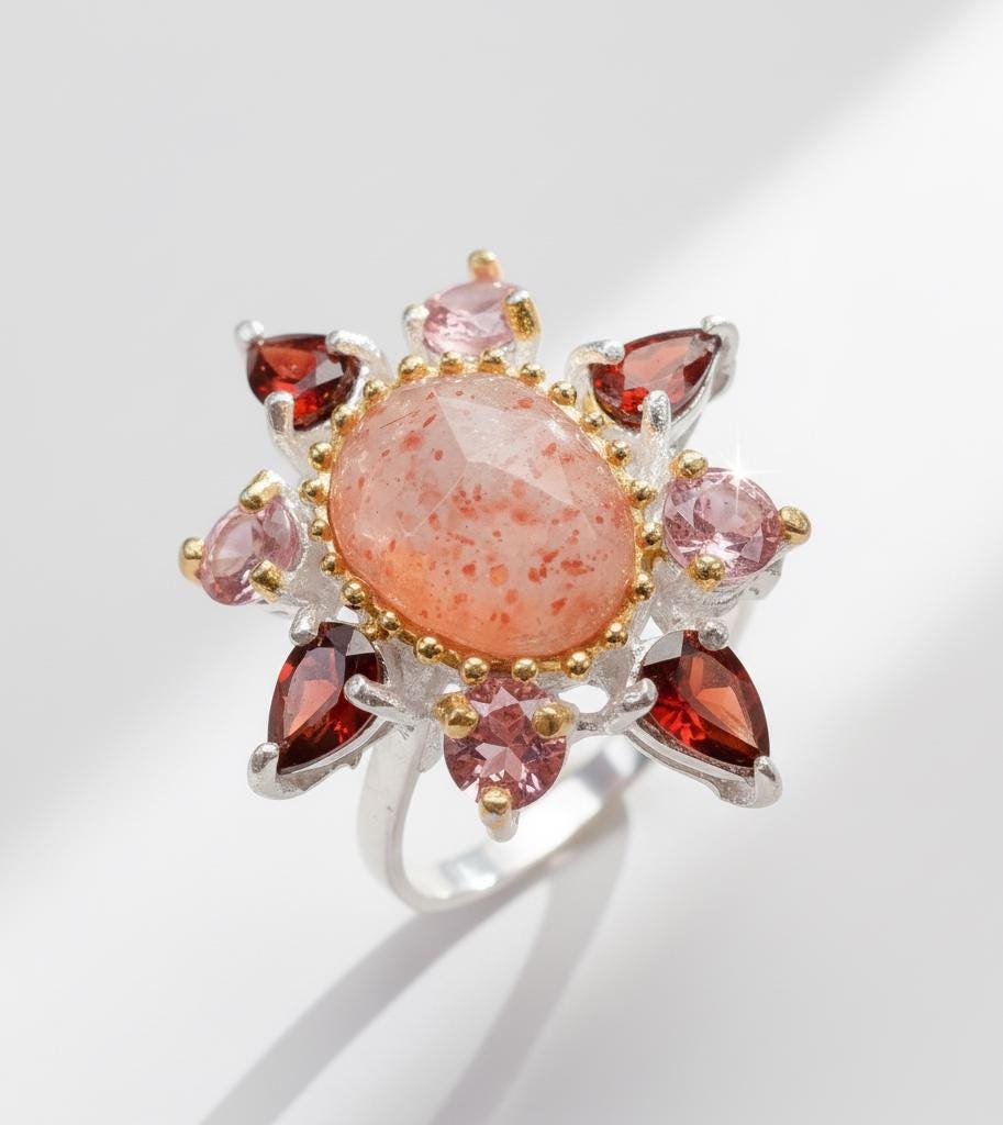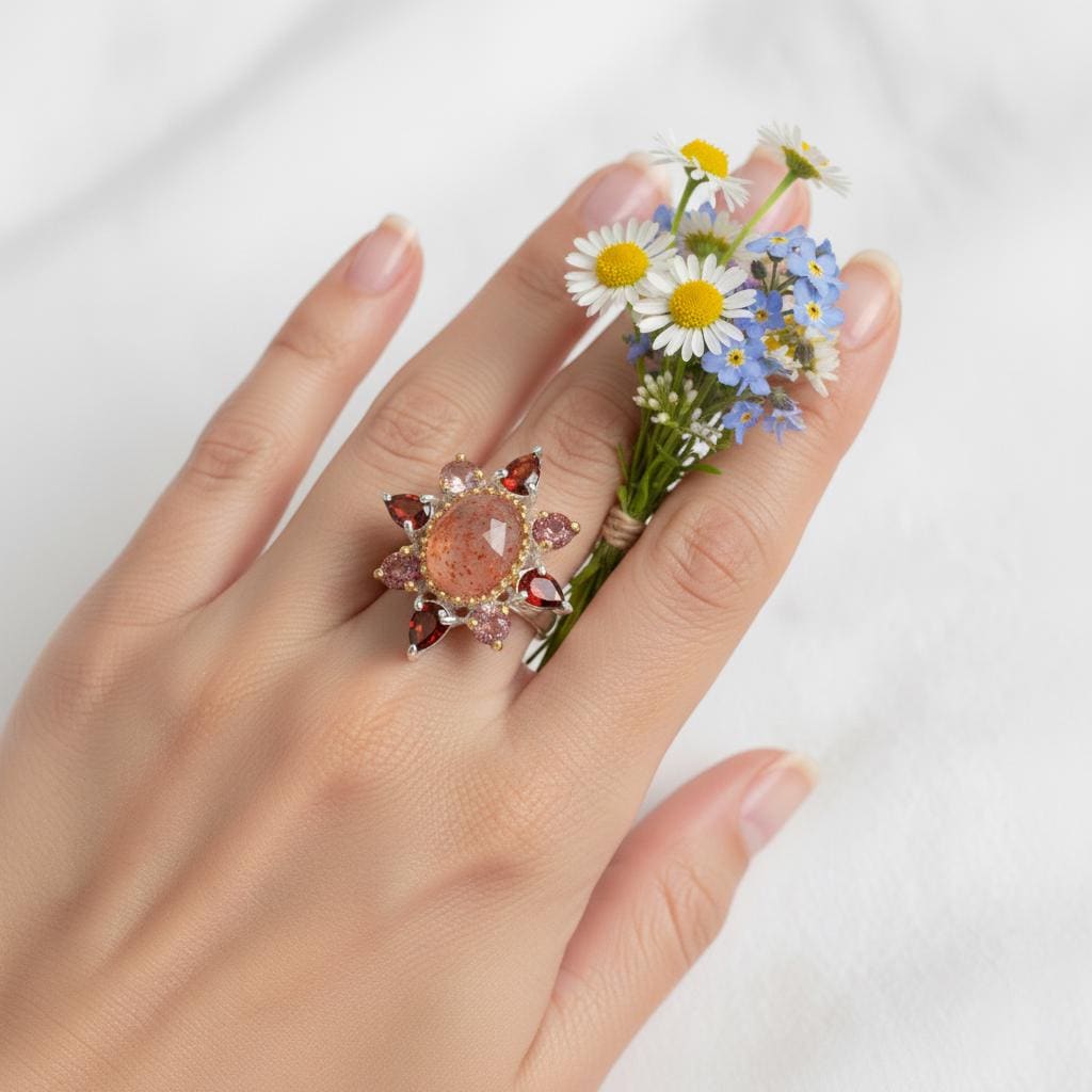 This Sunstone Ring radiates warmth and elegance with its rose-cut gemstone set in 925 sterling silver. A symbol of vitality and love, the sunstone glows with soft peach and gold tones, making it a perfect Christmas gift for wife, anniversary ring, or boho accessory for everyday wear. Handcrafted with meticulous attention to detail, this vintage-inspired halo ring blends modern femininity and timeless charm, ideal for women who appreciate handmade gemstone jewelry. Whether chosen as a delicate silver ring or unique bohemian piece, it captures light, joy, and effortless sophistication.
